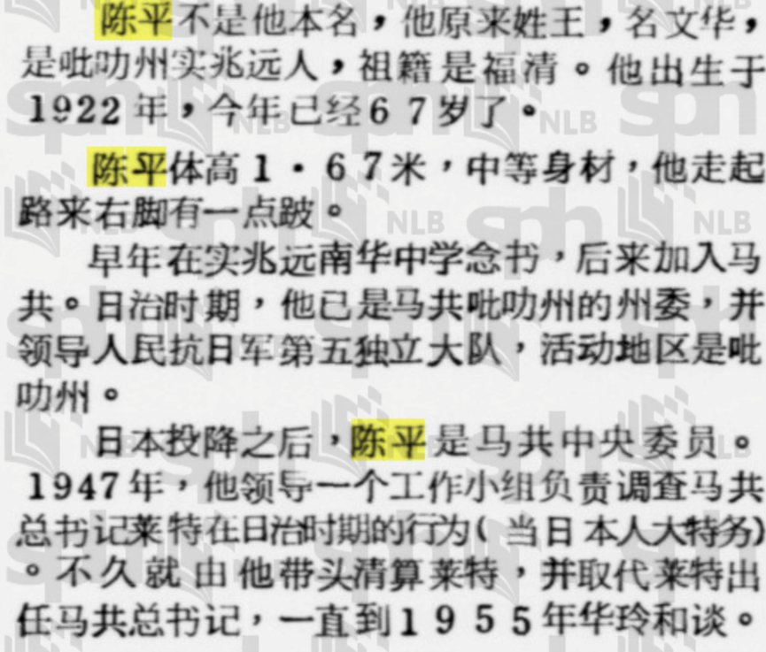 [23] 陈平、伊恩沃德(Ian Ward)、诺玛米拉佛洛尔(Norma Miraflor)《我方的历史:陈平回忆录》,新加坡:Media Master Pte Ltd出版,2004年10月出版,P373-P40
